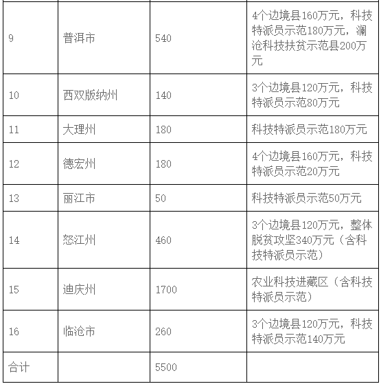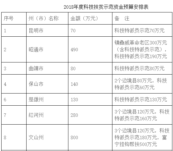 各州(市)科技局: 为深入贯彻习近平总书记扶贫开发战略思想,全面落实党中央、国务院和省委、省政府关于脱贫攻坚的重要部署和要求,按照《云南省科技厅关于“十三五”科技扶贫工作的实施意见》,进一步发挥科技对精准扶贫精准脱贫的示范带动作用,2018年省科技厅在省科技计划中安排“科技扶贫示范”资金(省对下转移支付),支持各州(市)开展相关科技扶贫示范工作。为做好资金安排和项目组织实施,省科技厅制定了《云南省科技厅科技扶贫示范项目实施方案》,现印发给你们,请认真贯彻执行。
