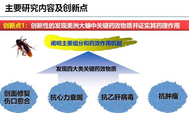 之后,课题组采用现代色谱和波谱以及现代药理学方法,阐明了美洲大蠊的主要化学组分和药效作用机制,为新药发现与创制提供了关键支撑。从物质基础、制剂工艺、药理学、毒理学、临床试验和评价等方面开展了原始创新性研究,.创新性的发现美洲大蠊中关键药效物质并证实其药理作用。发现了蜚蠊抗心力衰竭、抗乙肝病毒和抗肿瘤等关键药效物质。分别于2004年和2005年研制了用于治疗心力衰竭的"心脉隆注射液"和治疗乙型肝炎的"肝龙胶囊",建立了新药的生产线和国家标准,实现系列药物的临床应用和产业化。后续研发的"生命活素"牙膏等日化产品已上市,抗肺癌中药"美蠊胶囊"正在进行临床前研究。