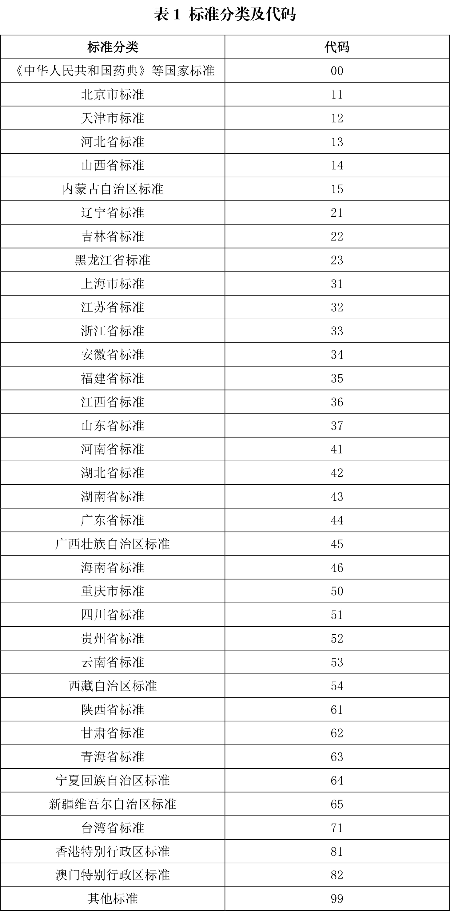 第2部分:标准分类码,用于区分国家标准和地方标准收录的中药饮片,用2位阿拉伯数字表示,用“00”表示药典标准、部(局)颁标准或进口药材标准等国家药材标准收录的中药饮片;用国家标准行政区划代码前两位表示地方标准收录的中药饮片,如“11”表示《北京市中药饮片标准》收录的中药饮片;“99”表示其他标准收录的品种。标准分类及代码见表1。