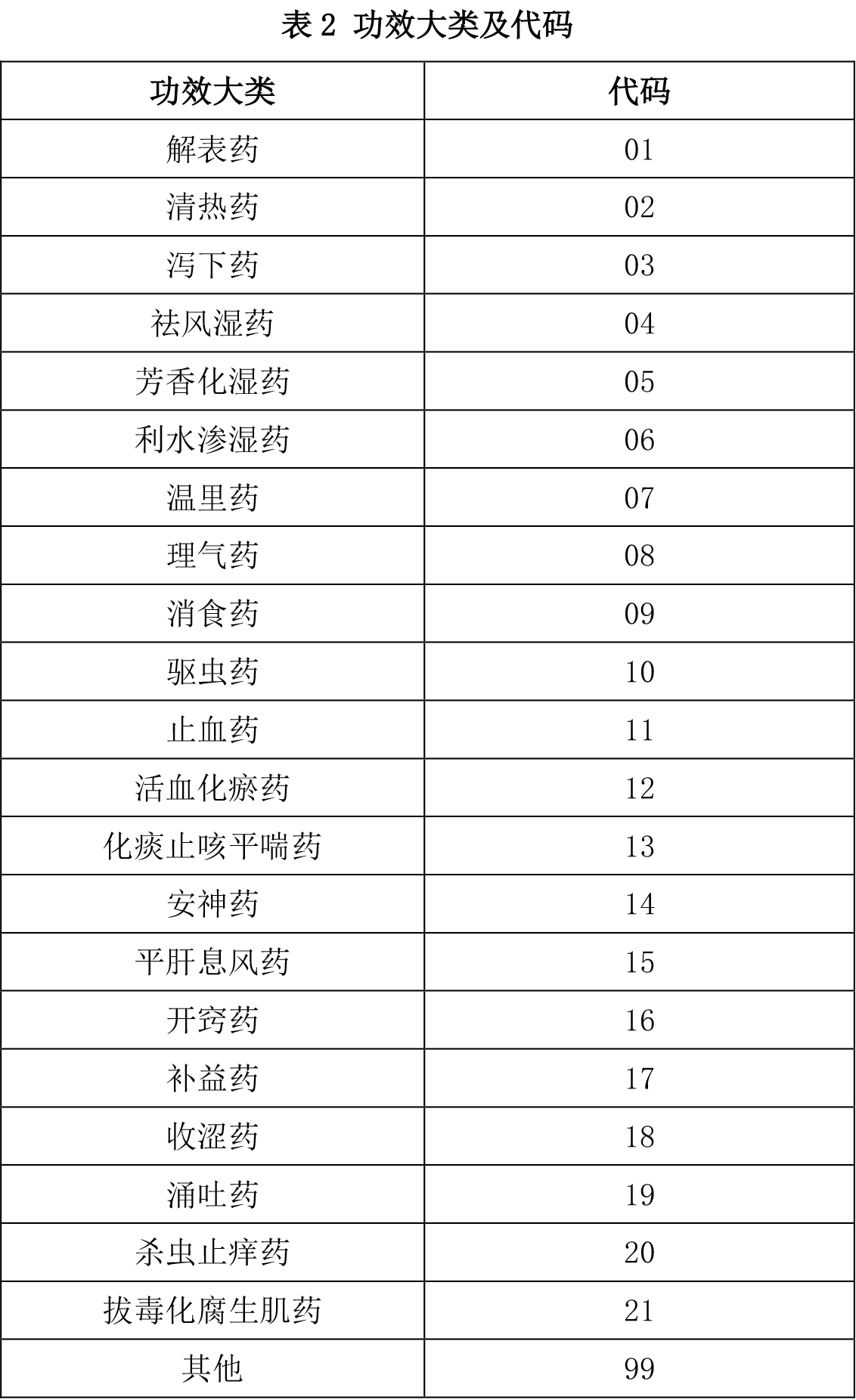 第3部分:功效分类码,根据中药功效大类划分,用2位阿拉伯数字表示。功效分类及代码见表2。