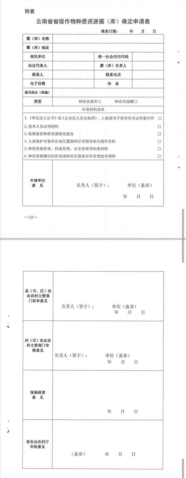 附表:云南省省级作物种质资源圃(库)确定申请表