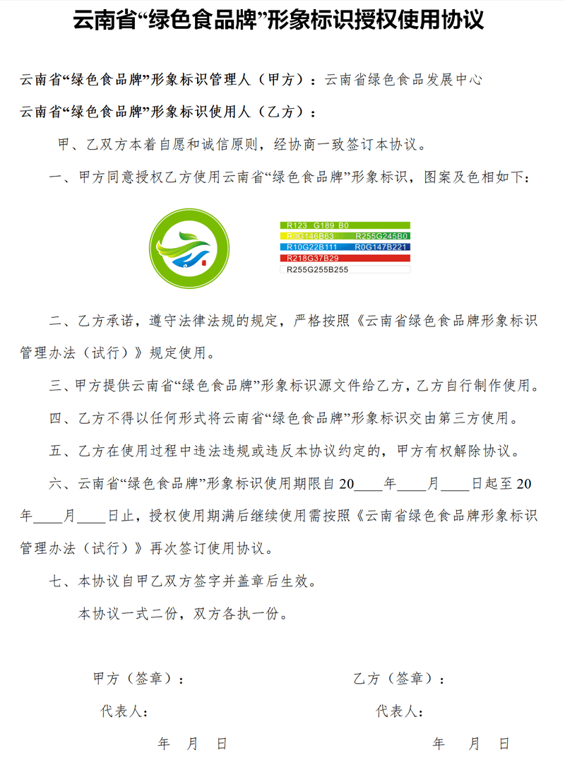 第五条 云南省“绿色食品牌”形象标识由使用主体向云南省绿色食品发展中心提出申请,经审核同意后,使用主体与云南省绿色食品发展中心签订云南省“绿色食品牌”形象标识授权使用协议(见附件)。云南省“绿色食品牌”形象标识使用权不得买卖或转让。