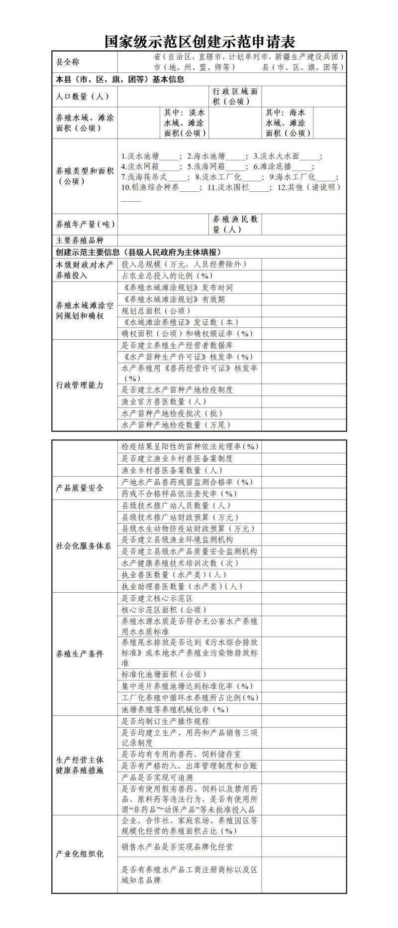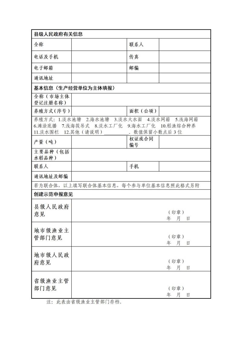 第五条 符合《国家级示范区基本条件》的水产养殖生产经营主体、县级人民政府,自愿提出申请。县级农业农村部门负责宣传动员、指导服务水产养殖生产经营主体做好申报工作。申请材料包括《国家级示范区创建示范申请表》(见附件2)、创建示范工作方案、其他证明材料等。由县级人民政府提出申请,经州(市)农业农村局报州(市)人民政府同意后,报省农业农村厅备案。