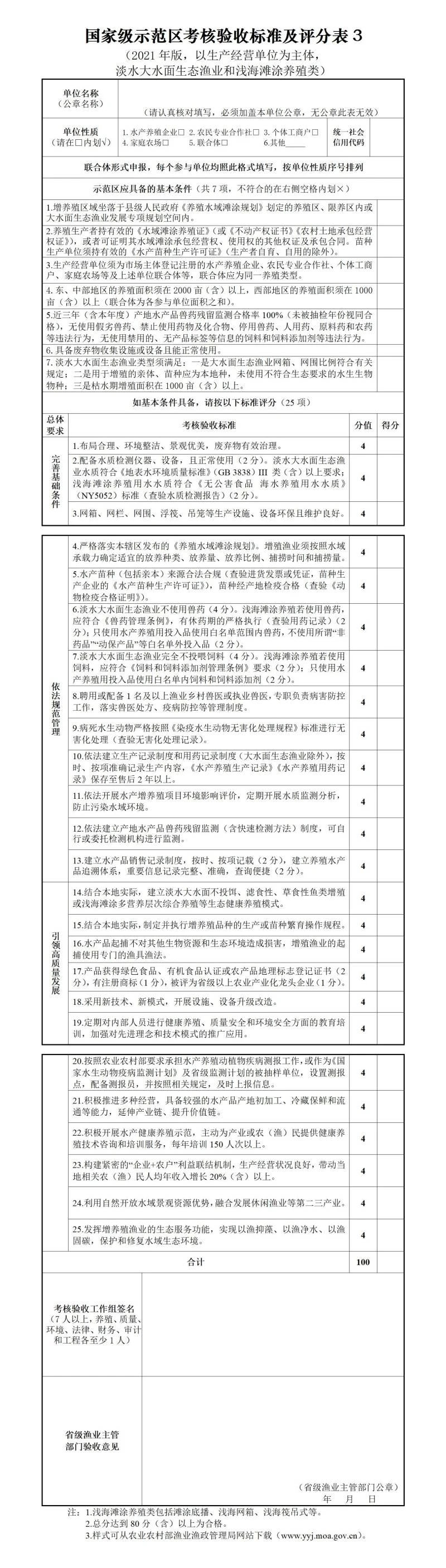 (二)东、中部地区的养殖面积须在2万亩(含)以上、养殖产量须在1万吨(含)以上;西部地区的养殖面积须在1万亩(含)以上、养殖产量须在3000吨(含)以上。