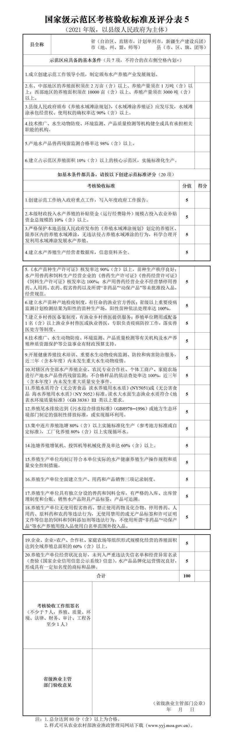 第九条 国家级示范区考核验收施行百分制,考核验收专家组或第三方机构应对照《考核验收标准》逐条严格考核,总分值在80分(含)以上为合格。