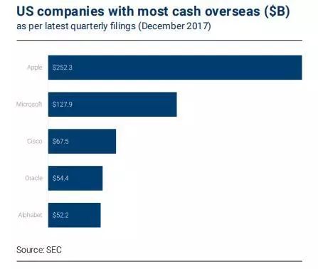 美国税改计划将使得美国公司能够以15.5%的税率从海外市场返回(美国)国内。对于现金丰富的高科技公司,如苹果、甲骨文、Alphabet和微软,这笔交易将允许他们从字面上带回数十亿美元的现金。对苹果而言,它有252亿美元的离岸利润将不再被美国征税。