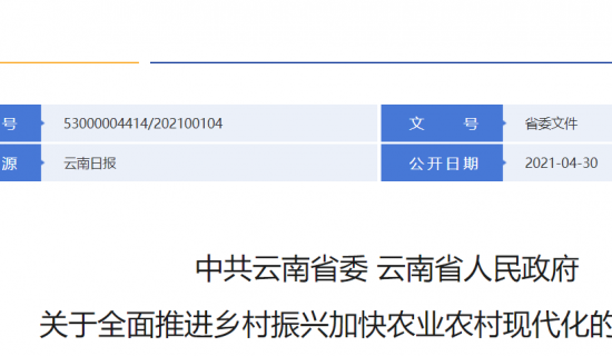 中共云南省委 云南省人民政府 关于全面推进乡村振兴加快农业农村现代化的实施意见