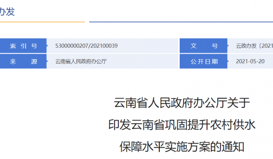 云南省人民政府办公厅关于 印发云南省巩固提升农村供水保障水平实施方案的通知