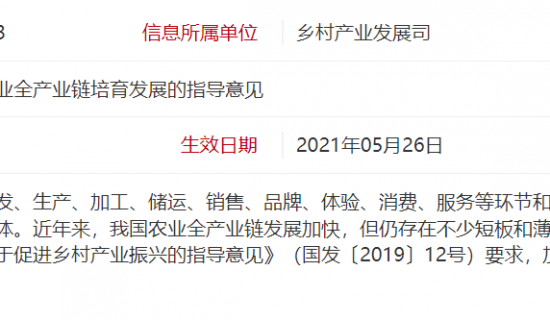 农业农村部关于加快农业全产业链培育发展的指导意见