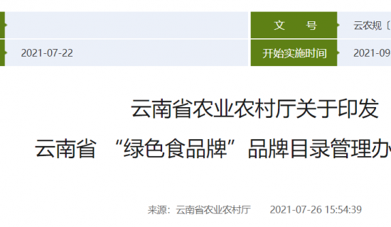 云南省农业农村厅关于印发 云南省 “绿色食品牌”品牌目录管理办法的通知