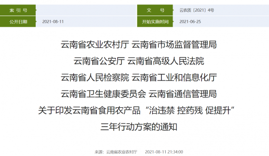 省农业农村厅、省市场监督管理局、省公安厅、省高级人民法院、省人民检察院、省工业和信息化厅、省卫生健康委、省通信管理局8部门将在全省联合实施为期3年的食用农产品“治违禁 控药残 促提升”行动,切实解决我省禁限用药物违法使用、常规农兽药残留超标等问题,严厉打击各类违法违规行为