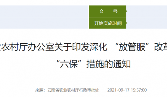 根据《云南省人民政府办公厅关于印发云南省深化“放管服”改革服务“六稳”“六保”实施方案的通知》(云政办发〔2021〕31号)要求,现将《云南省农业农村厅深化“放管服”改革服务“六稳”“六保”措施》印发给你们,请结合工作实际,认真抓好落实。