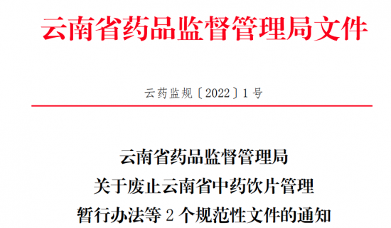云南省药品监督管理局关于废止 云南省中药饮片管理暂行办法 等2个规范性文件的通知
