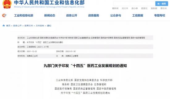 各省、自治区、直辖市及计划单列市、新疆生产建设兵团工业和信息化、发展改革、科技、商务、卫生健康、应急管理、医疗保障、药品监管、中医药管理部门:现将《“十四五”医药工业发展规划》印发给你们,请结合实际,认真贯彻实施。