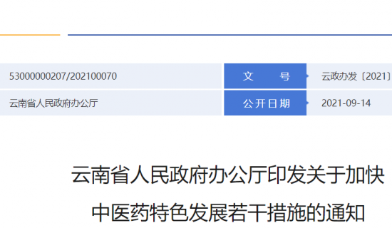 云南省人民政府办公厅印发关于加快中医药特色发展若干措施的通知