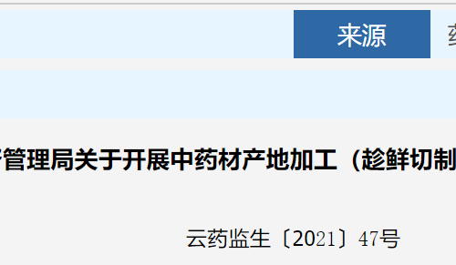为推进我省中药材产地趁鲜加工工作,提升中药饮片质量管理水平,促进中医药产业高质量健康发展,经云南省药品监督管理局(以下简称云南省药监局)2021年第8次局务会讨论决定,在全省范围开展中药材产地加工(趁鲜切制)试点工作,现将有关事宜通知如下