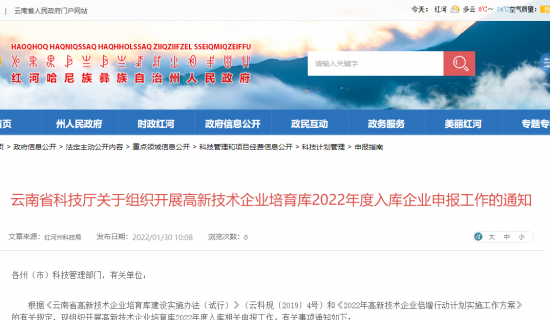 云南省科技厅关于组织开展高新技术企业培育库2022年度入库企业申报工作的通知