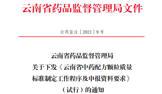 云南省药品监督管理局 关于下发《云南省中药配方颗粒质量 标准制定工作程序及申报资料要求》 (试行)的通知