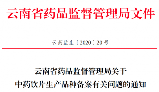 云南省药品监督管理局关于中药饮片生产品种备案有关问题的通知 云药监生〔2020〕20号