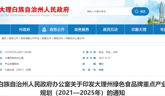 大理白族自治州人民政府办公室关于印发大理州绿色食品牌重点产业发展规划(2021—2025年)的通知
