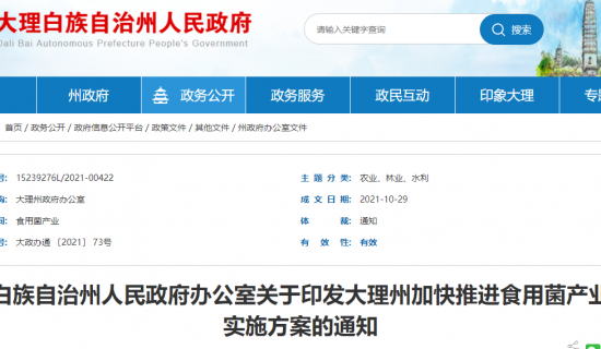 大理白族自治州人民政府办公室关于印发大理州加快推进食用菌产业发展实施方案的通知