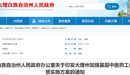 大理白族自治州人民政府办公室关于印发大理州加强基层中医药工作规划暨实施方案的通知