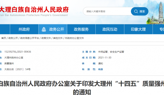 大理白族自治州人民政府办公室关于印发大理州“十四五”质量强州规划的通知