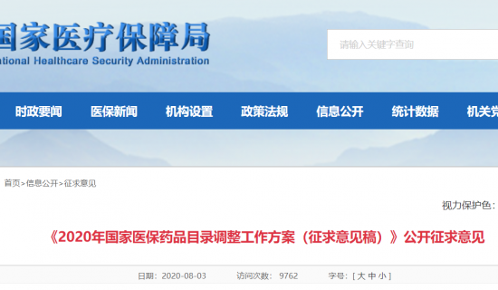 《2020年国家医保药品目录调整工作方案(征求意见稿)》公开征求意见