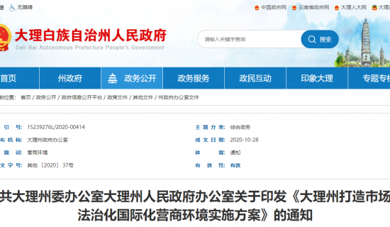 中共大理州委办公室大理州人民政府办公室关于印发《大理州打造市场化法治化国际化营商环境实施方案》的通知