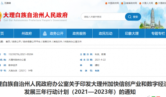 大理白族自治州人民政府办公室关于印发大理州加快信创产业和数字经济发展三年行动计划(2021—2023年)的通知