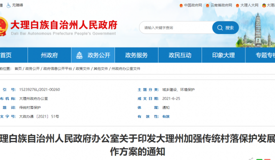 大理白族自治州人民政府办公室关于印发大理州加强传统村落保护发展工作方案的通知