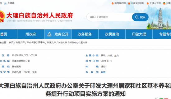 大理白族自治州人民政府办公室关于印发大理州居家和社区基本养老服务提升行动项目实施方案的通知