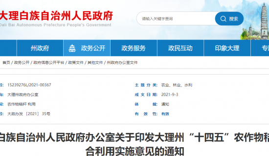大理白族自治州人民政府办公室关于印发大理州“十四五”农作物秸秆综合利用实施意见的通知