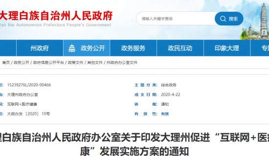 大理白族自治州人民政府办公室关于印发大理州促进“互联网+医疗健康”发展实施方案的通知