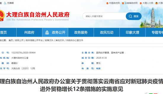 大理白族自治州人民政府办公室关于贯彻落实云南省应对新冠肺炎疫情促进外贸稳增长12条措施的实施意见