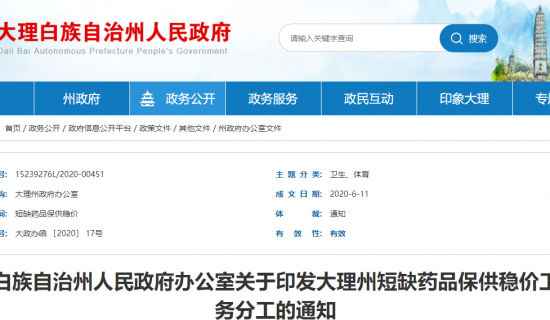 《大理州短缺药品保供稳价工作任务分工》已经州人民政府研究同意,现印发给你们,请认真组织实施。
