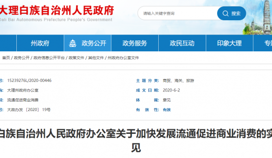 大理白族自治州人民政府办公室关于加快发展流通促进商业消费的实施意见