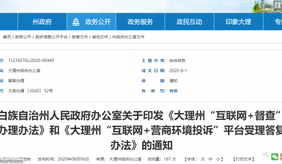 《大理州“互联网+督查”平台留言办理办法》和《大理州“互联网+营商环境投诉”平台受理答复工作办法》已经州人民政府同意,现印发你们,请认真贯彻执行。