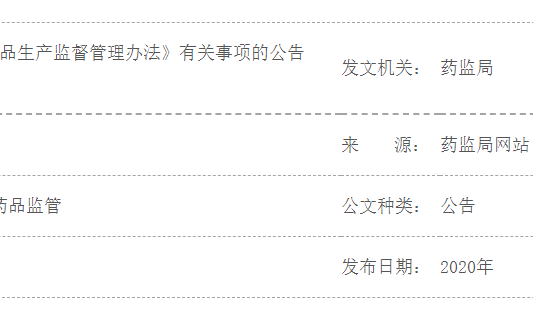 《药品生产监督管理办法》(国家市场监督管理总局令第28号,以下简称《生产办法》)已发布,自2020年7月1日起施行。