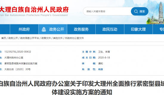大理白族自治州人民政府办公室关于印发大理州全面推行紧密型县域医共体建设实施方案的通知