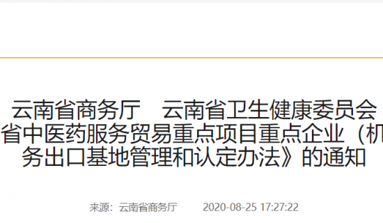 云南省商务厅关于《云南省中医药服务贸易重点项目、重点企业(机构)及中医药服务出口基地管理和认定办法》的公示