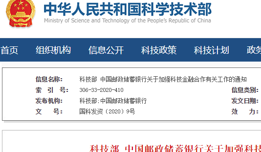 科技部 中国邮政储蓄银行关于加强科技金融合作有关工作的通知