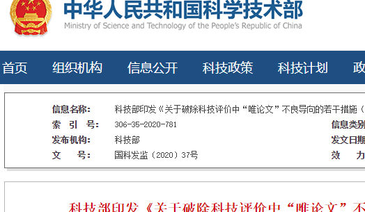 科技部印发《关于破除科技评价中“唯论文”不良导向的若干措施(试行)》的通知