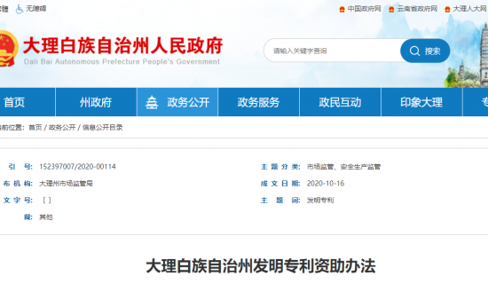 为支撑大理创新驱动发展,推动创新成果保护与运用,提升大理发明专利质量、提高发明专利的有效量,结合实际,大理州市场监督管理局制定了《大理白族自治州发明专利资助办法》,现将《办法》全文向社会公布。