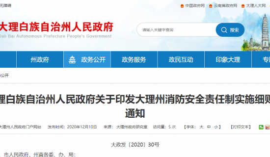 大理白族自治州人民政府关于印发大理州消防安全责任制实施细则的通知