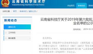 云南省科技厅关于2019年第六批拟入库国家科技型中小企业名单的公示