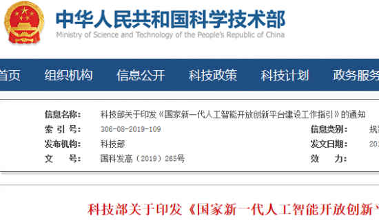 科技部关于印发《国家新一代人工智能开放创新平台建设工作指引》的通知