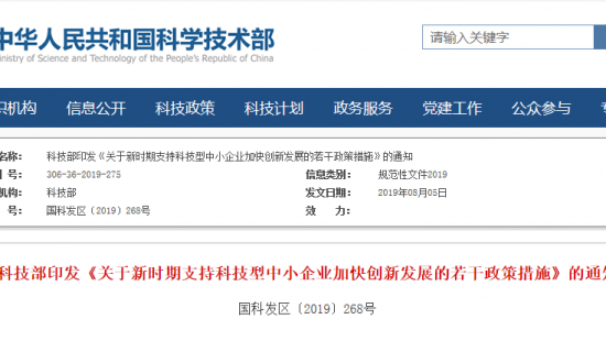 科技部印发《关于新时期支持科技型中小企业加快创新发展的若干政策措施》的通知