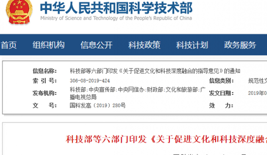 科技部等六部门印发《关于促进文化和科技深度融合的指导意见》的通知