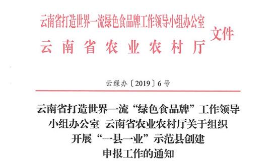 云南省打造世界一流“绿色食品牌”工作领导小组办公室、云南省农业厅研究制定《云南省“一县一业”示范县创建申报指南》。